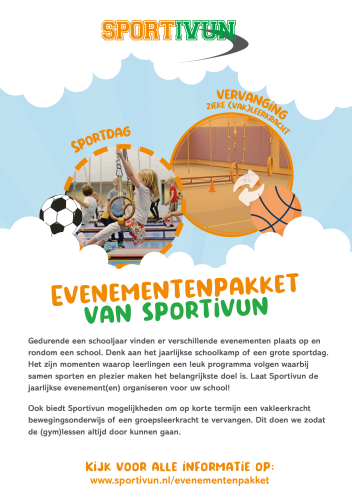 Met het Evenementenpakket bent u een jaar lang voorzien van de leukste (sportieve) evenementen op uw school! Meer informatie over het Evenementenpakket van Sportivun? Klik dan op een van de links hierboven. U kunt ook meer informatie – evenals een offerte – opvragen door onderstaand contactformulier in te vullen of te bellen met 035 30 30 035.