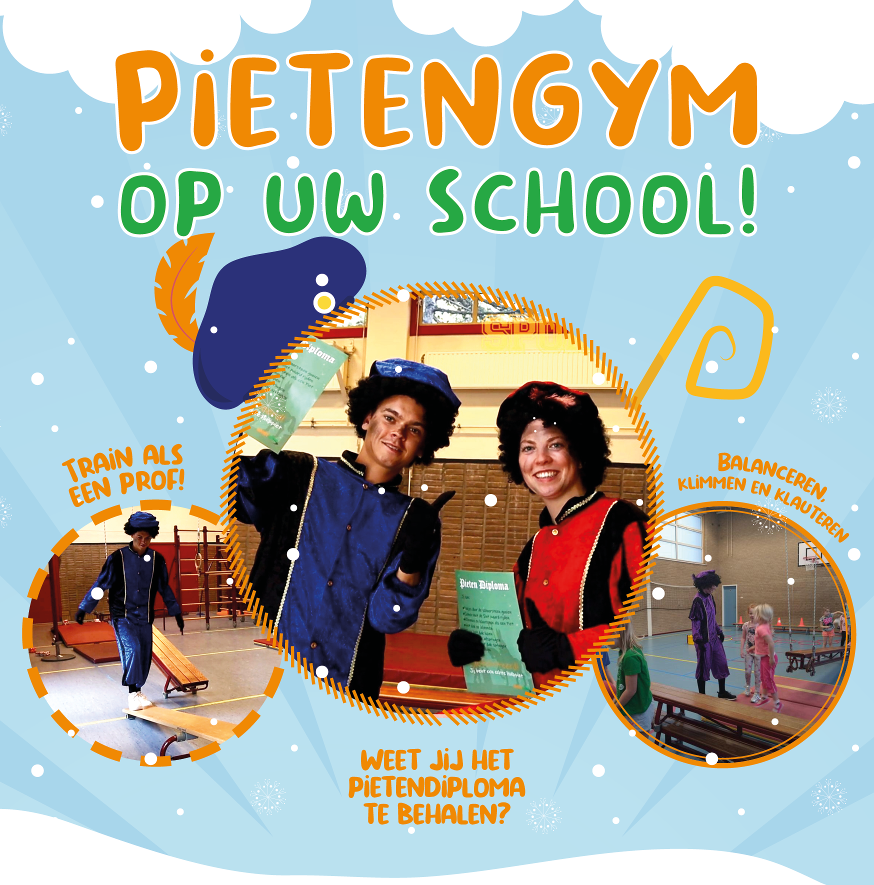 - Pietengym is geschikt voor alle kinderen tussen de 2 en 12 jaar middels een leuk Sinterklaasverhaal. De onderbouw wordt middels laagdrempelige spelletjes zoals pakketjes overgooien en balanceren over de daken, opgeleid tot Piet. De bovenbouw krijgt ook stoere klim- en klautertraining, zodat ze als echte hulp-Piet klaar voor zijn om over daken te rennen en in schoorstenen te klimmen;